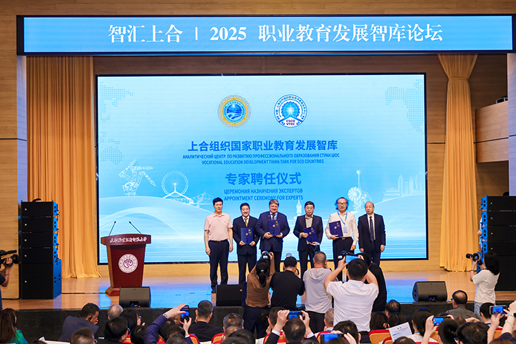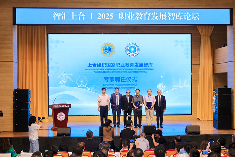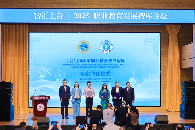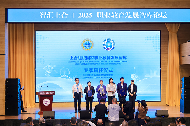 上合組織國家職業教育發展智庫專家聘任環節,中國教育部課程教材研究所副所長曾天山,天津教育委員會副主任羅延安,天津職業技術師范大學校務委員會主席張金剛,天津職業技術師范大學校長鄭清春,中國教育部魯班工坊建設專家委員會主任呂景泉,天津職業技術師范大學黨委副書記李靖為智庫專家頒發聘書。