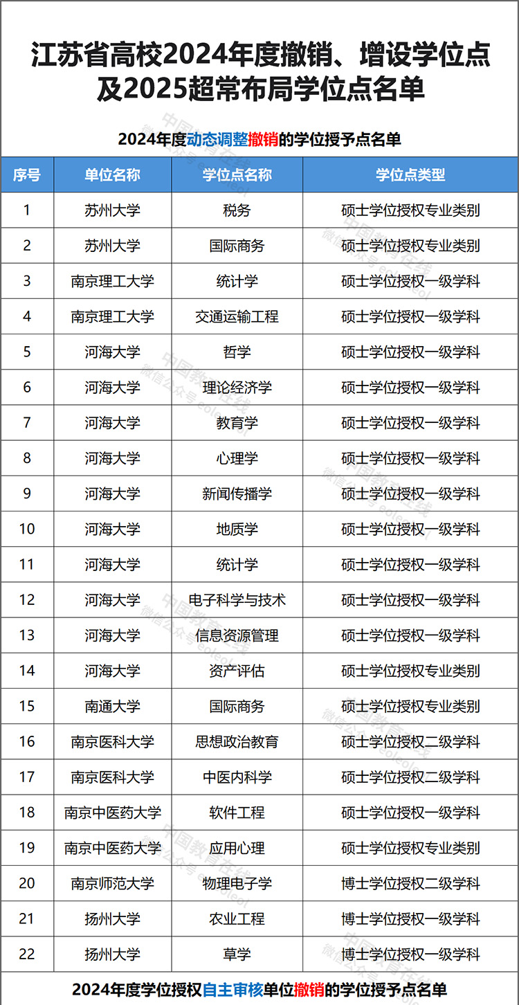 據統計,2024年度,江蘇省學位授權自主審核單位撤銷6個學位點,動態調整撤銷22個學位點,共撤銷28個學位點;學位授權自主審核單位增設7個學位點,動態調整增設17個學位點,共增設24個學位點。2025年,超常布局2個學位點。