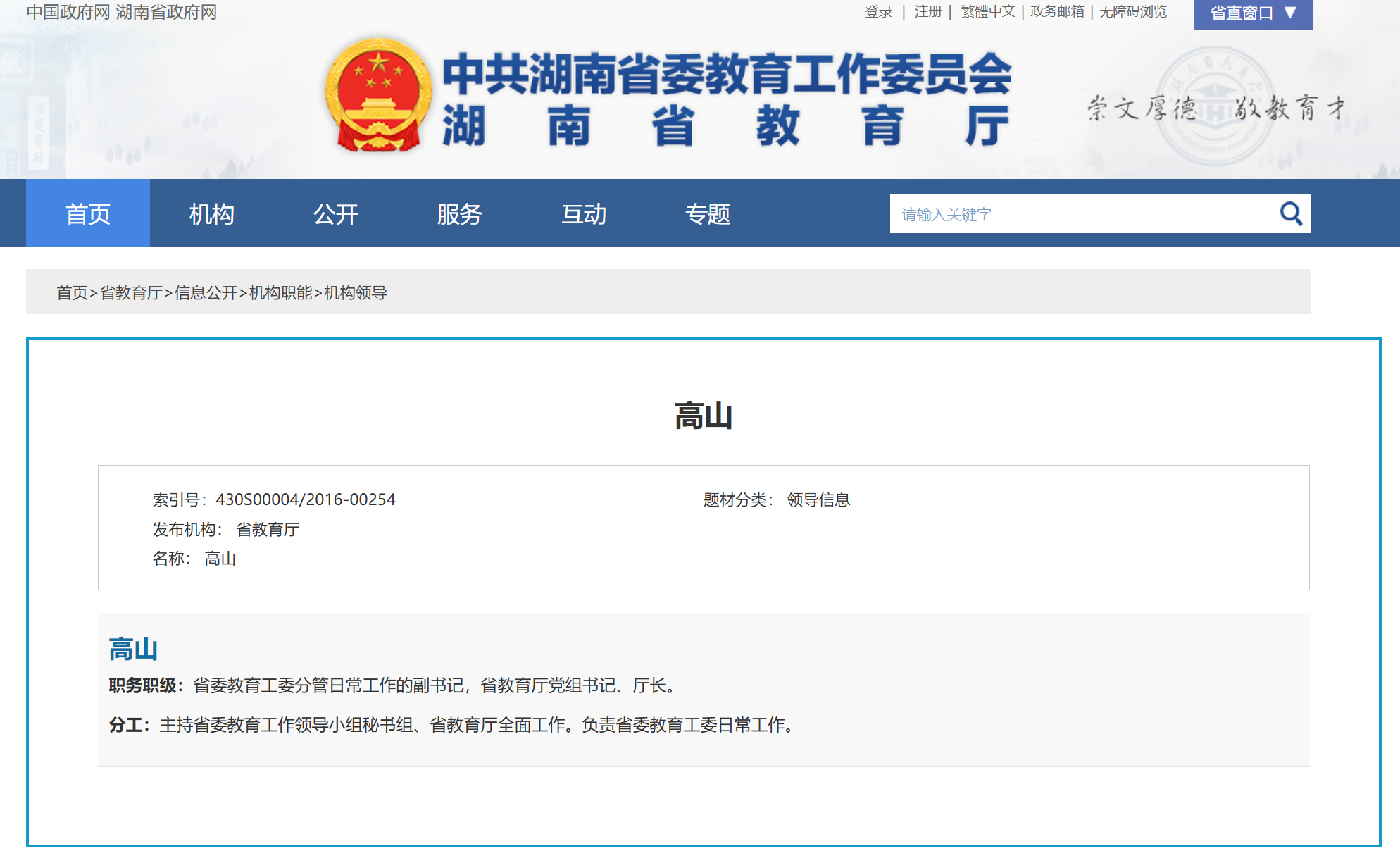 湖南省教育廳官網日前更新顯示,高山已任省委教育工委分管日常工作的副書記,省教育廳黨組書記、廳長。主持省委教育工作領導小組秘書組、省教育廳全面工作。負責省委教育工委日常工作。