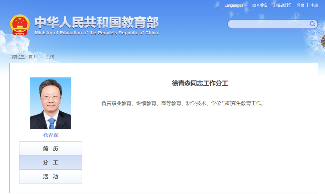 近日,教育部官網更新了教育部領導的分工,徐青森副部長分管職業教育、繼續教育、高等教育、科學技術、學位與研究生教育工作。