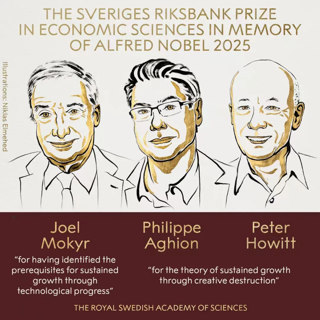 北京時間10月13日,2025年諾貝爾經濟學獎獲獎得主揭曉。2025年諾貝爾經濟學獎授予Joel Mokyr、Philippe Aghion、Peter Howitt,以表彰他們“解釋了創新驅動的經濟增長”。其中一半授予Joel Mokyr,以表彰他“通過技術進步確定了持續增長的先決條件”,另一半則共同授予Philippe Aghion、Peter Howitt,以表彰他們關于“通過創造性破壞實現持續增長”的理論。獲獎獎金為1100萬瑞典克朗(約合人民幣826萬元)。