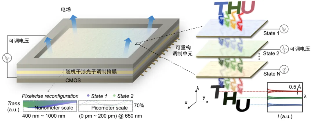 “我們提出可重構計算光學成像架構,將物理分光限制轉化為光子調制與重建過程,挖掘隨機干涉掩膜與鈮酸鋰材料的電光重構特性,實現了高維光譜調制與高通量解調的協同計算。”方璐介紹,團隊由此研制出亞埃米級高分辨光譜成像芯片——“玉衡”,無需在波長維度犧牲通量,每個像素均可獲取完整光譜信息,快照光譜成像的分辨能力提升兩個數量級,突破了光譜分辨率與成像通量無法兼得的長期瓶頸。