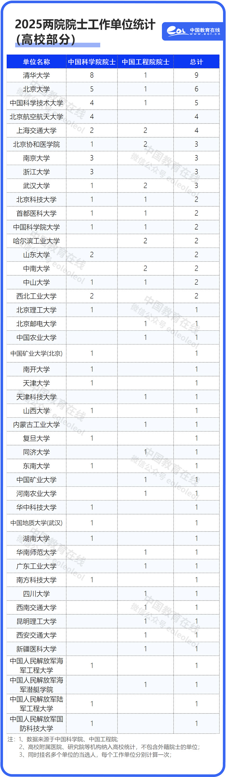 2025年兩院增選院士工作單位(高校部分)統計如下(不含外籍院士):