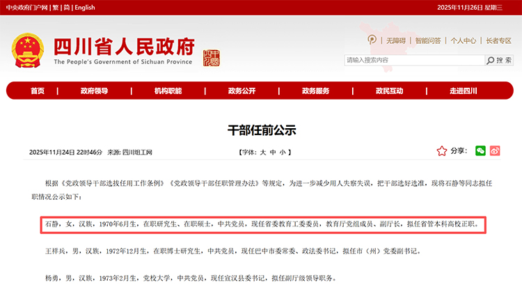 11月24日,四川省委組織部發布《四川干部任前公示》,其中: