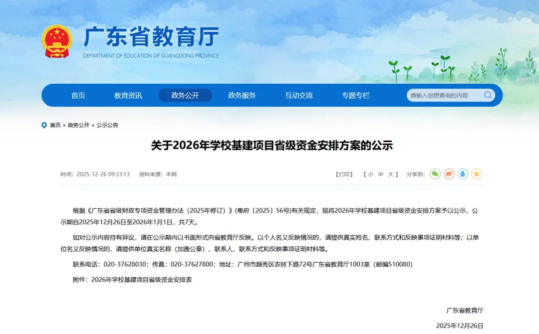12月26日,廣東省教育廳發布《關于2026年學校基建項目省級資金安排方案的公示》。2026年擬安排預算額度共60058.39萬元,發放至華南師范大學、華南農業大學、仲愷農業工程學院、廣東省電子職業技術學校、暨南大學共5所學校。