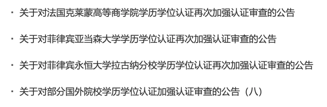 其中一個重要措施就是對海外“水文憑”的認證治理。從2021年至今,教育部留學服務中心先后發布了8次加強認證的通告,對存在濫發文憑嫌疑的海外高校增加認證環節,延長認證周期。這8次通告共涉及幾十所海外高校,主要是來自菲律賓等東南亞國家與個別歐洲國家,其中菲律賓私立高校高居榜首,18所私立高校被警示“加強認證”,其中菲律賓永恒大學與亞當森大學均是二次上榜,可以說是“慣犯”。