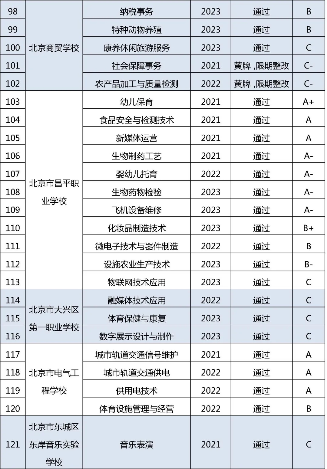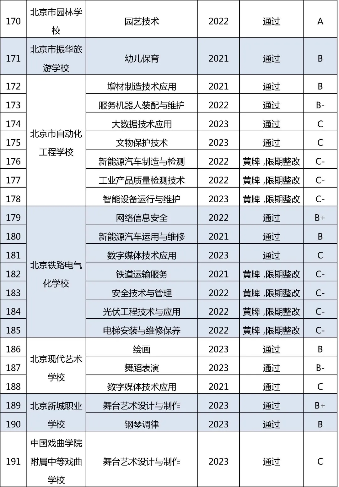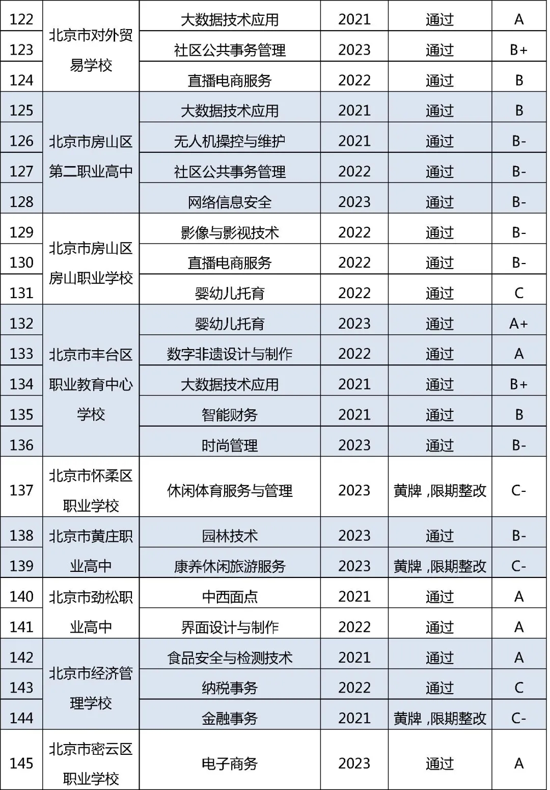 近日,2024年北京市職業院校近三年新增專業質量監測評價結果公布。評價結果顯示,36所職校163個專業予以通過,17所職校的28個專業給予“黃牌、限期整改”,要求限期整改。其中,9所高職的13個專業為“黃牌、限期整改”。