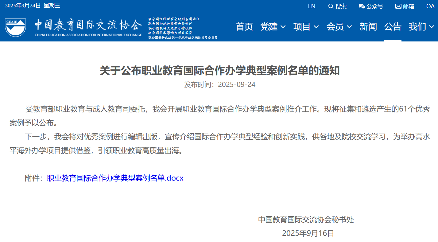 9月24日,中國教育國際交流協會發布《關于公布職業教育國際合作辦學典型案例名單的通知》,受教育部職業教育與成人教育司委托,中國教育國際交流協會開展職業教育國際合作辦學典型案例推介工作。現將征集和遴選產生的61個優秀案例予以公布。根據名單,全國共有52所高職院校入選。
