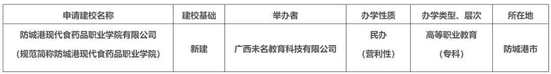 根據《中華人民共和國高等教育法》《普通高等學校設置暫行條例》《高等職業學校設置標準(暫行)》等有關規定,經廣西壯族自治區高等學校設置評議委員會考察和評議,正式設立防城港現代食藥品職業學院有限公司(規范簡稱防城港現代食藥品職業學院)事項獲得通過,現予以公示。公示期為2026年3月23日至2026年3月27日。公示期內,如有不同意見,可本著實事求是的原則,通過郵寄或電子郵件的方式實名反映。我們將對有關問題進行調查核實,并為反映人保密。