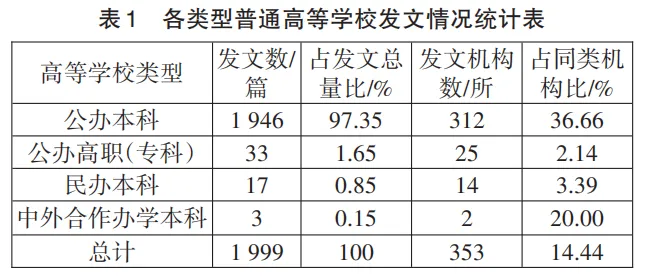 在納入統計范圍的2151篇高等教育科研論文中,剔除第一作者署名單位為境外高校(含港澳臺)以及政府機關、教育服務機構、科研院所、軍事院校等的文章152篇,獲得第一作者署名單位為境內普通高校的高等教育科研論文共計1999篇,以此作為本分析報告的數據基礎。