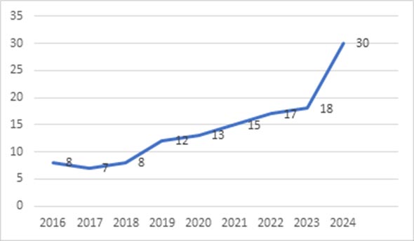2016年至2024年中國大陸高校進入泰晤士高等教育世界大學排名世界前400名的高校數量趨勢