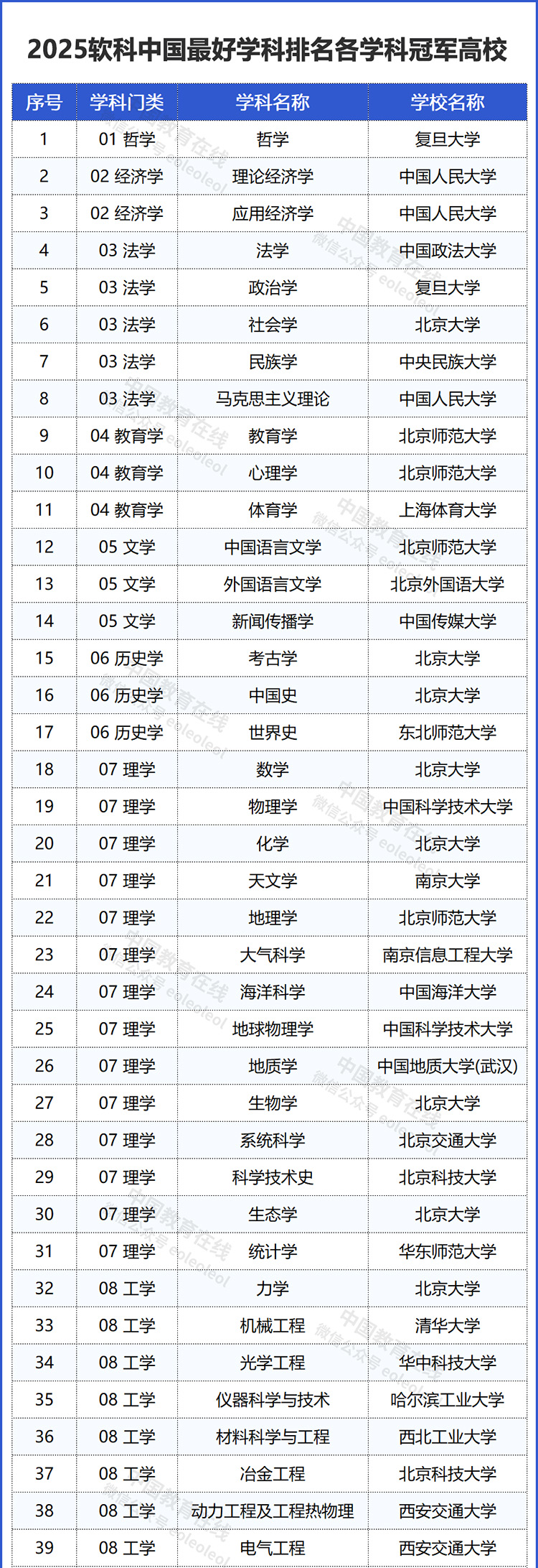 2025軟科中國最好學科排名發布,各學科冠軍高校名單出爐
