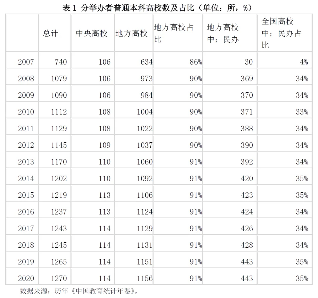 從學校數來看(表1),2007—2020年,中央高校增加了8所,地方高校增加了522所(占比從86%增加到91%);地方高校中,民辦高校增加了413所(在全國高校中占比從4%增加到35%)。從在校生數來看(表3),中央高校增加了25萬人,地方高校增加了776萬人(占比從84%增加到90%);地方高校中,民辦高校增加了282萬人(在全國高校學生數中占比從18%增加到26%)。總之,在全國普通本科高校中,無論是學校數還是在校生數,地方普通本科高校都占90%及以上,在規模上占據主體地位。