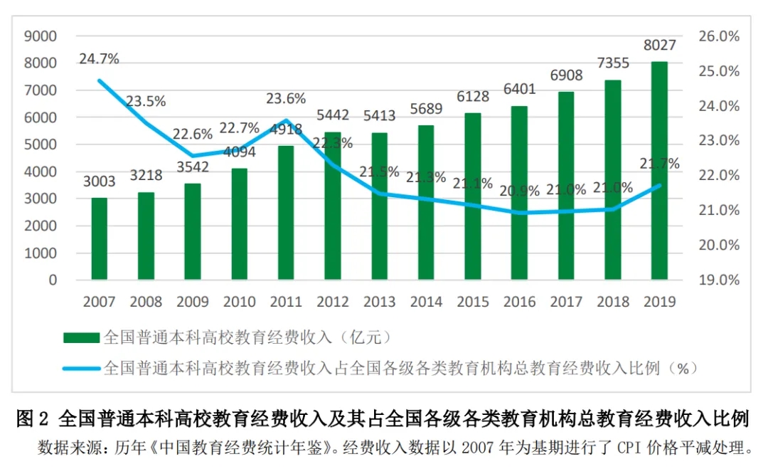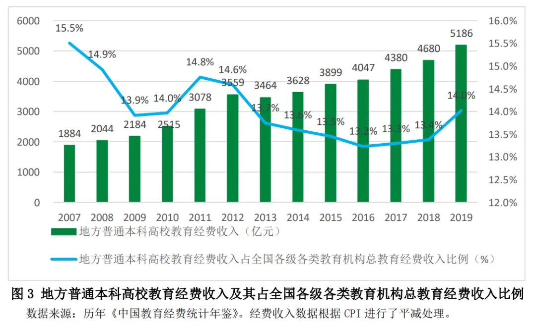圖2和圖3顯示的是2007—2019年全國和地方普通本科高校(含民辦)教育經費收入及其占全國各級各類教育機構教育經費總收入比例的情況。2007—2019年,全國普通本科高校教育經費收入從3003億元增長到8027億元,地方普通本科高校教育經費收入從1884億元增長到5186億元(數據經過消費者物價指數平減)。從2007—2019年我國普通本科高校教育經費收入占全國各級各類教育機構教育經費總收入的比例來看,總體來看,全國普通本科高校的經費收入占比在21%~25%之間波動,地方普通本科高校的經費收入占比在13%~16%之間波動。