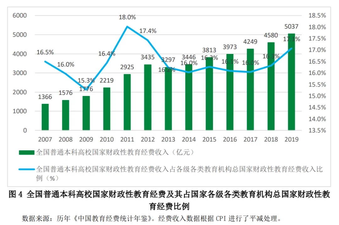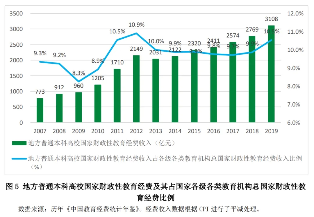 圖4和圖5顯示的是2007—2019年全國和地方普通本科高校國家財政性教育經費收入及其占全國各級各類教育機構國家財政性教育經費總收入比例的情況。2007—2019年,全國普通本科高校國家財政性教育經費收入從1366億元增長到5037億元,地方普通本科高校國家財政性教育經費收入從773億元增長到3108億元(數據經過消費者物價指數平減)。從各級各類教育機構國家財政性教育經費總計中普通本科高校的占比來看,全國普通本科高校的占比在15%~18%之間波動,2011年最高,為18.0%;地方普通本科高校的占比在8%~11%之間波動, 2012年最高,為10.9%。