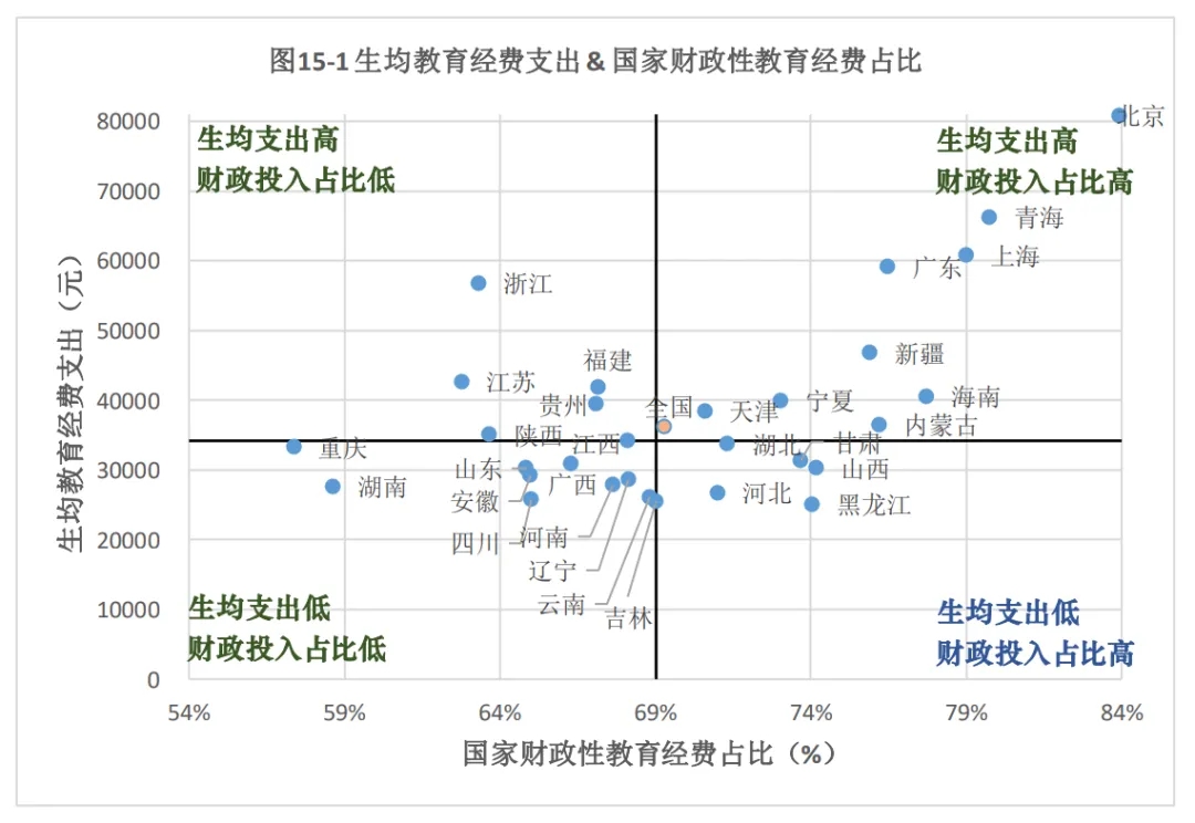 (3)生均教育經費支出高、而財政投入占比低的地區,包括浙江、江蘇、福建等。這幾個省經濟相對發達,財政投入和非財政性投入都比較高,因此生均教育經費支出水平較高。而由于非財政性投入高從而使得財政性教育經費占比顯得相對較低。總的來看,教育經費投入壓力相對較小。