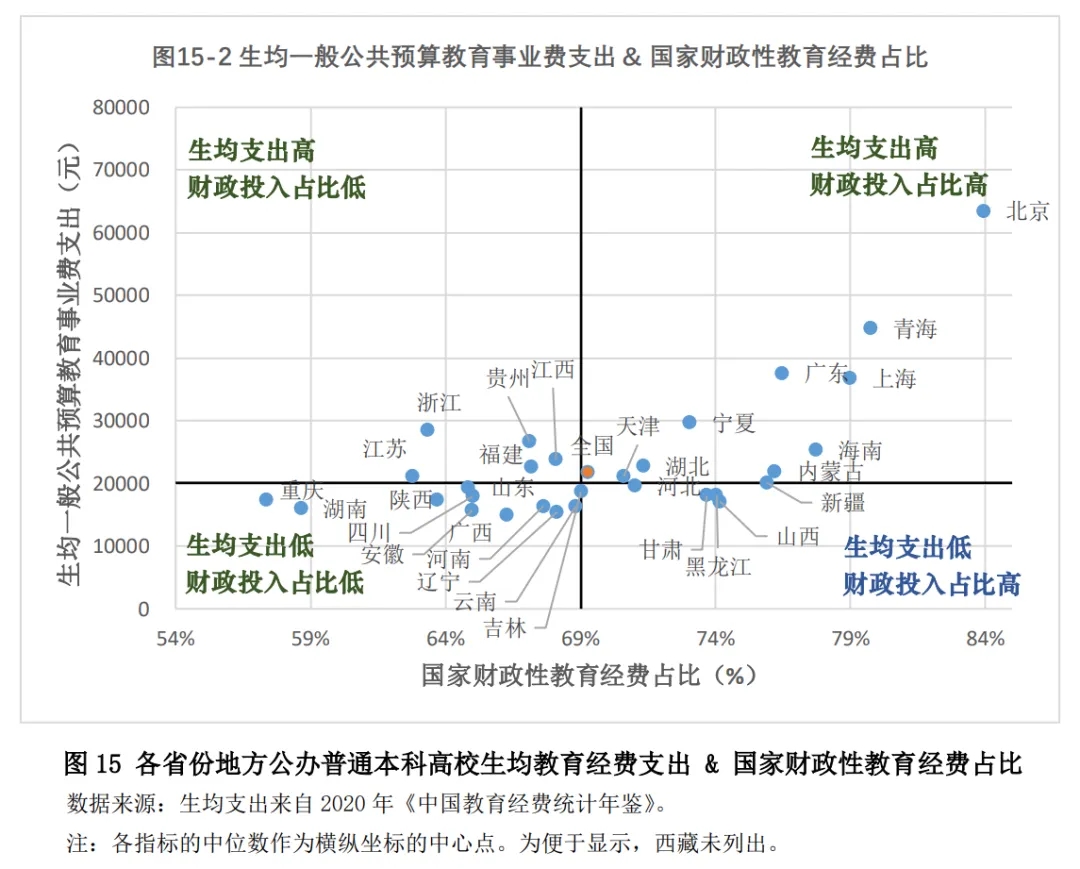 此外,生均教育經費支出水平低,且財政性教育經費占比低的省份,其地方普通本科高校的投入問題也是需要更多關注的。這類地區以西部和中部地區為主,也包括東北部地區的個別省份。要進一步提高教育投入水平,財政投入仍須更多努力。