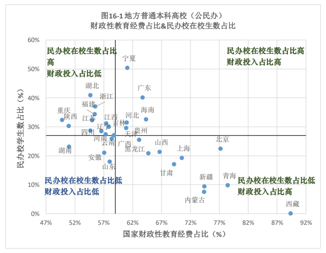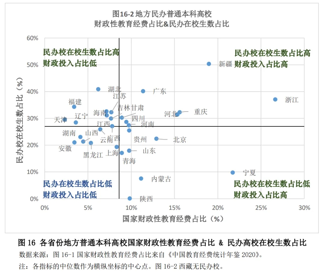 從地方普通本科高校(公民辦)、地方民辦普通本科高校的國家財政性教育經費占比,以及民辦高校在校生數占比來看(見圖16),各省份地方普通本科高校教育事業發展和教育投入情況呈現出幾種不同的類型: