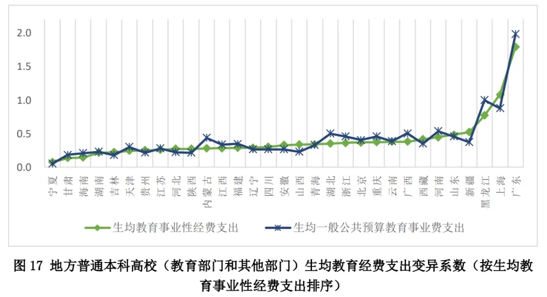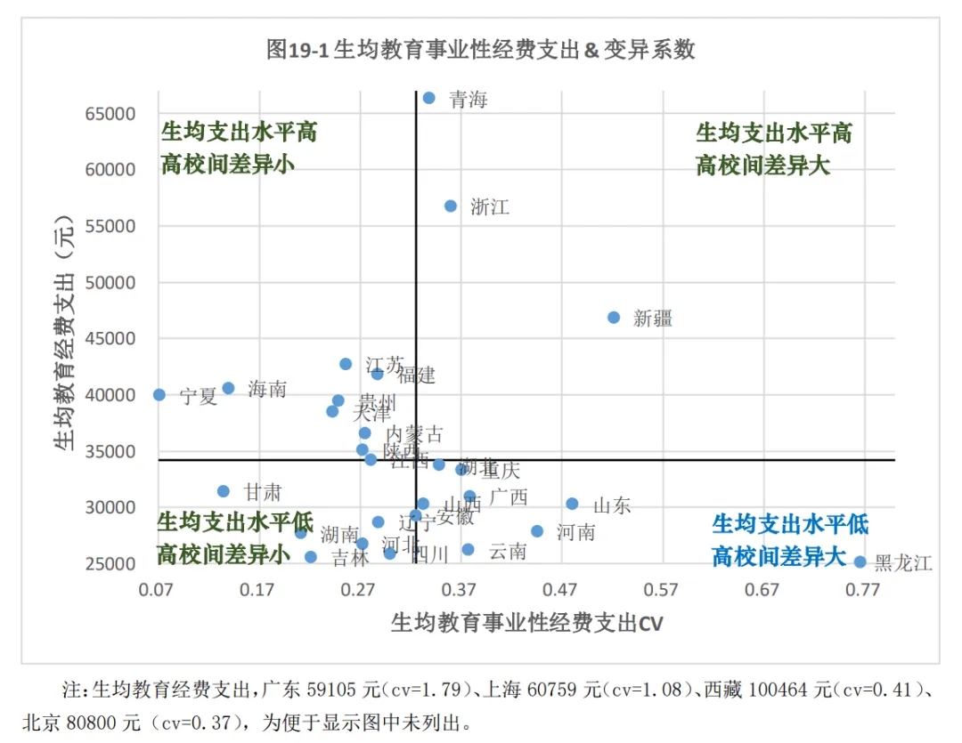 可以看出,經濟發達地區普遍生均教育事業性經費支出水平高,但分成了高校間差異大和高校間差異小兩類。其可能的原因,一是高校數量,高校數量多的省份更可能高校間差異大;二是高校類型,理工、農、醫、綜合等高校類型齊全的省份更可能高校間差異大;三是有藝術院校(音樂學院、電影學院、戲劇學院、舞蹈學院等)、體育院校、警察學院等特殊院校的地區,比如北京、上海,高校間差異大;四是部分財力較好的地區,比如深圳等,對部分高校的財政支持力度較大從而使得省內高校間差異大。更嚴謹的分析還有待未來進一步研究。