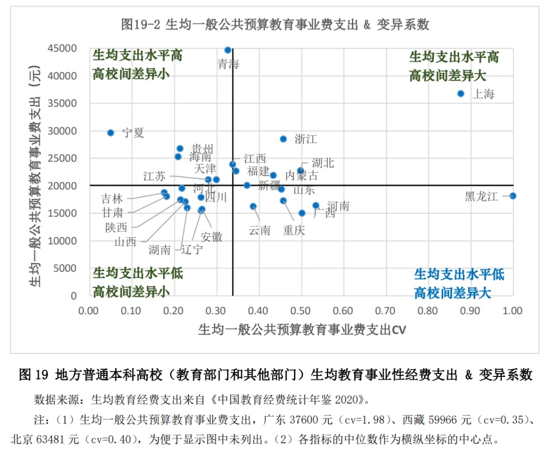 基于上述分析,我們從生均教育事業性經費支出水平及其變異系數綜合來看各省份的投入情況(見圖19):