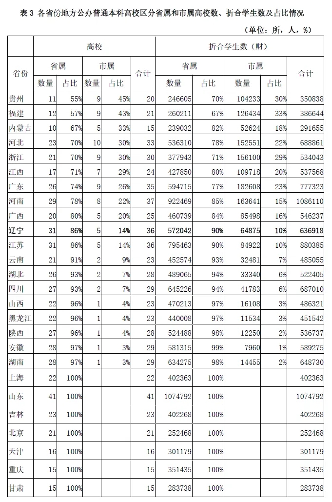 從各省份省屬和市屬高校(注:省屬和市屬高校根據地區代碼來分類)的分布情況來看(見表3),總體來說還是省屬高校占比高。在既有省屬又有市屬高校的19個省份中,遼寧作為中位數,其市屬高校占比為14%。高于這一比例的省份,比如貴州、福建、內蒙古、河北、浙江等;低于這一比例的省份,比如江蘇、云南、湖北等。從省屬和市屬高校的學生分布情況來看,基本與省屬和市屬的高校分布情況類似。上海、山東等12個省份僅有省屬高校。