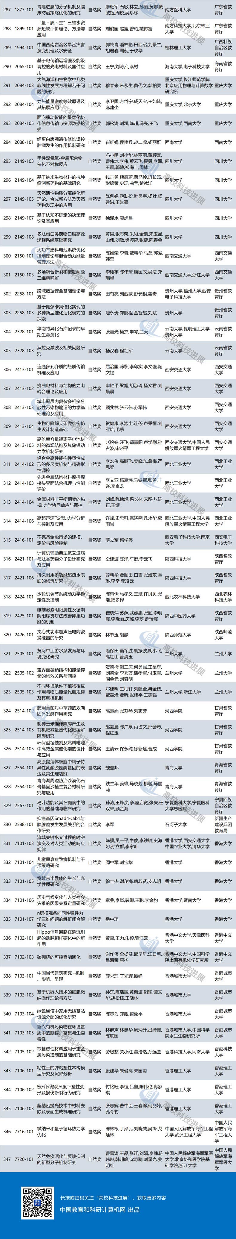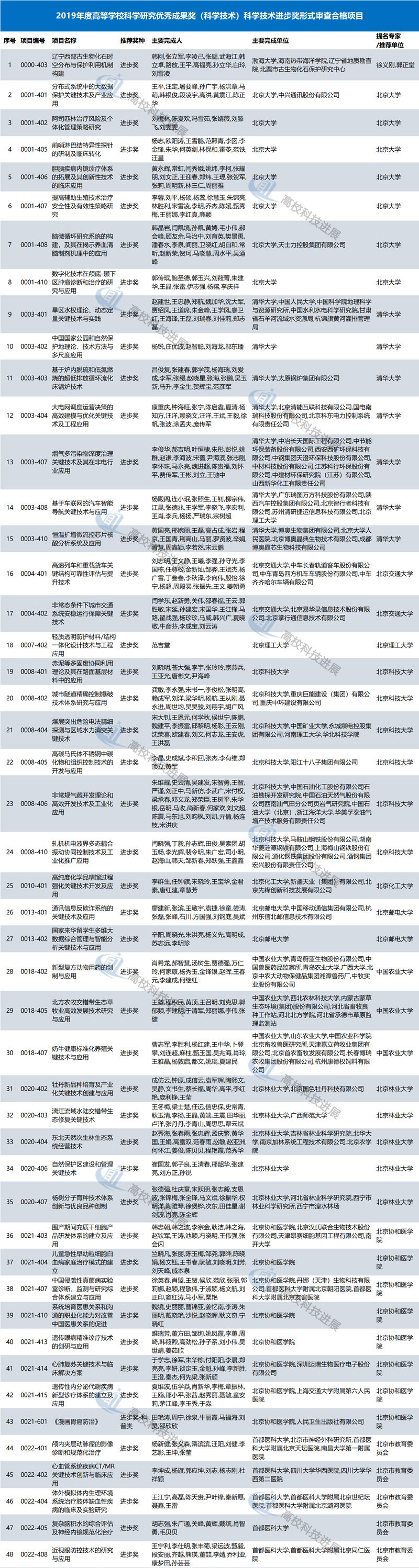 科學技術進步獎共有422項(通用項目406項,專用項目16項)形式審查合格。在通用項目的統計結果中,共有167所高校以第一完成單位牽頭的項目通過審查。形式審查合格項目較多的高校分別是上海交通大學16項,浙江大學14項,同濟大學10項,江南大學9項,北京協和醫學院、東北大學和中國石油大學(華東)均為8項,北京大學、清華大學、武漢大學和中國礦業大學各有7項,北京科技大學、東南大學、中南大學、首都醫科大學、江蘇大學分別有6項,北京林業大學、中國礦業大學(北京)、中國醫科大學、河海大學、中國海洋大學、華中科技大學、中山大學、華南理工大學、中國人民解放軍海軍軍醫大學以及五邑大學各有5項。
