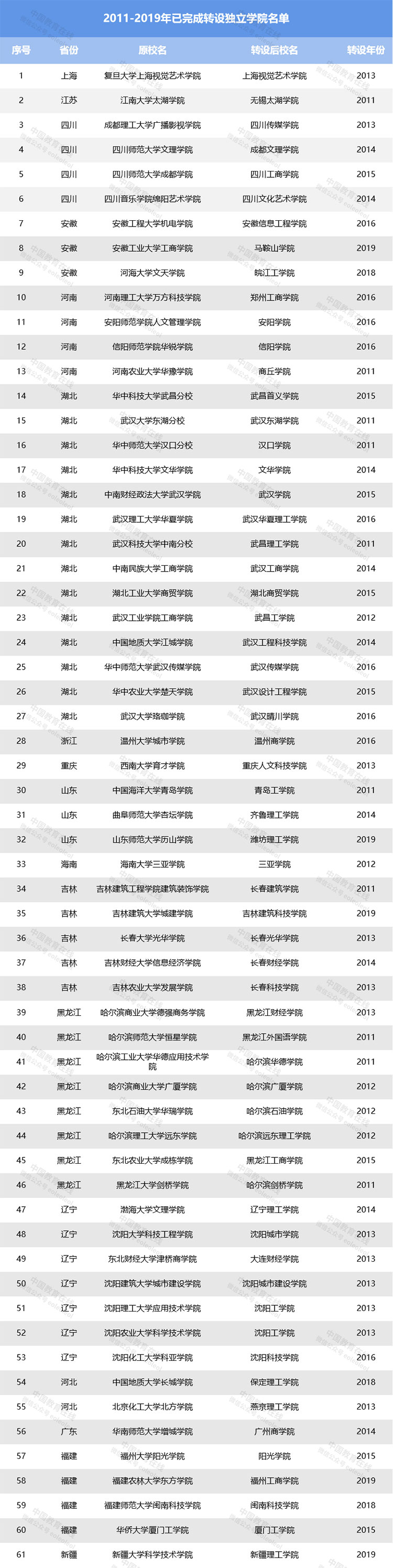 2020年5月,教育部辦公廳下發《關于加快推進獨立學院轉設工作的實施方案》,提出到2020年末,各獨立學院全部制定轉設工作方案,并推動一批獨立學院實現轉設。原則上,中央部屬高校、部省合作共建高校舉辦的獨立學院要率先完成轉設,其他獨立學院要盡早完成轉設。
