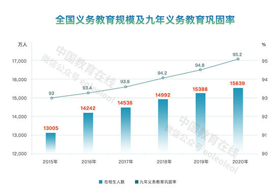 2015年,全國共有義務教育階段在校生1.3億人,義務教育鞏固率為93%,到2020年,全國共有義務教育階段在校生1.56億人,九年義務教育鞏固率95.2%,比2015年提高了2.2個百分點。