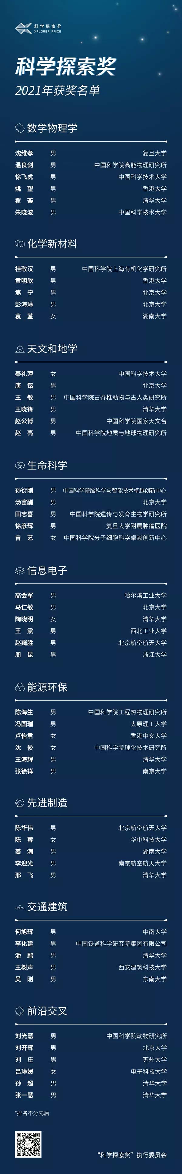 據悉,“科學探索獎”于2018年設立,三年來共評選出150位獲獎人。作為科學家主導的公益項目,獎項秉持“面向未來、獎勵潛力、鼓勵探索”三大宗旨,鼓勵青年科技人才探索基礎科學和前沿技術的“無人區”,探索社會支持基礎研究人才持續穩定的投入機制。