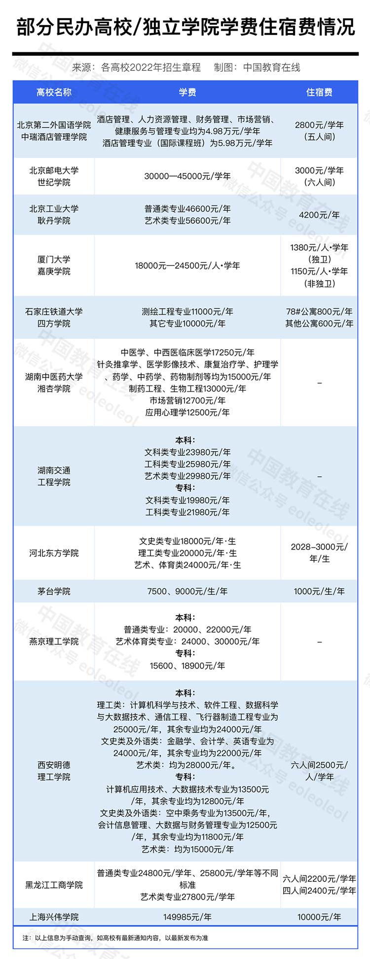而民辦大學一般收費較高,整體學費在1萬—6萬每學年不等,也有部分收費較低的高校,如茅臺學院學費有7500、9000元/生/年等不同標準,收費較高的如中瑞酒店管理學院酒店管理專業(國際課程班)每學年學費為5.98萬元,在獨立學院里排在前位。