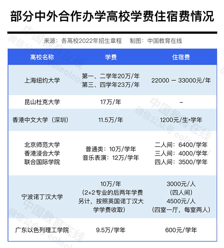 中外合作辦學高校則是所有大學類型中收費最高的,動輒十幾二十萬的學費標準,堪比出國留學的費用。公辦大學也有中外合作等部分高收費專業,如華中科技大學生物科學(中外合作辦學)專業學費達到10.8萬元/年,相比該校普通專業的學費堪稱“天價”。