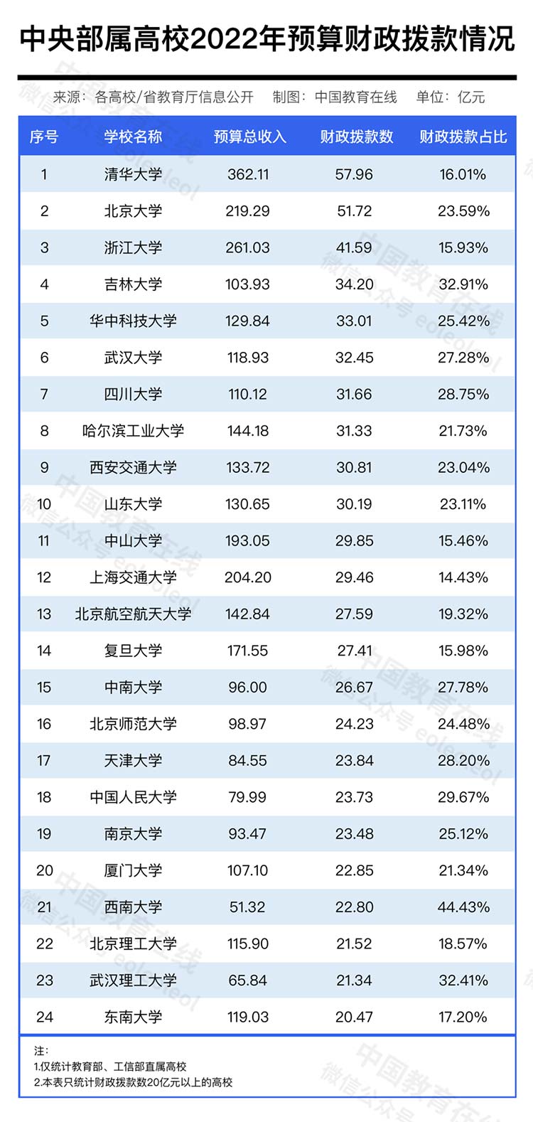 目前我國公辦高等學校經費收入來源主要是財政撥款和學費收入。在中央部屬高校公布的2022年預算財政撥款情況中,清華大學以中央財政撥款57.96億元排在首位,北京大學51.72億元緊隨其后,財政撥款超過20億元的高校達到24所,絕大多數都是985高校。