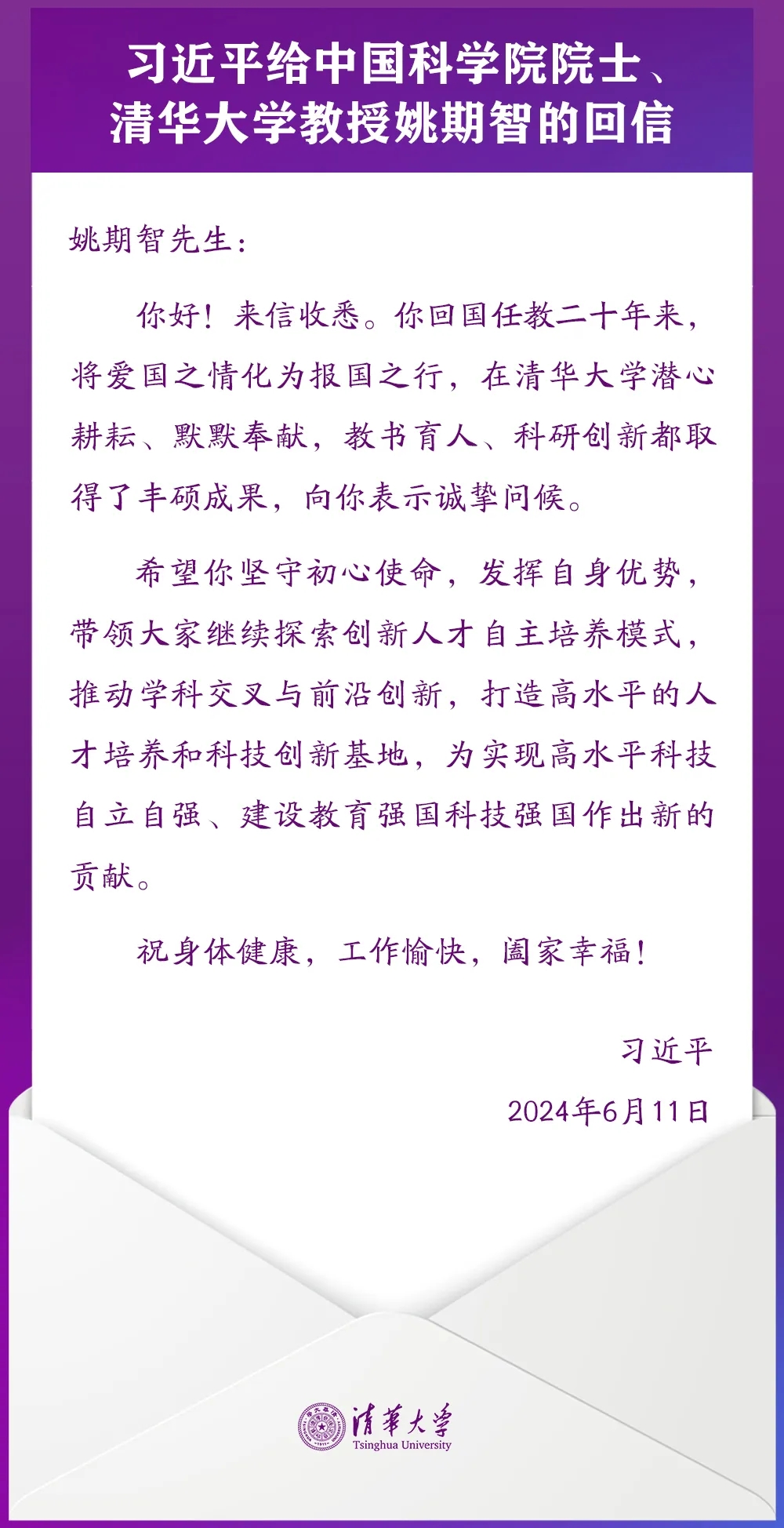 姚期智寄出了一封信。這封信寫給中共中央總書記、國家主席、中央軍委主席習近平,他匯報了自己回國任教20年來培養人才、科研創新等情況,表達了科技報國、為實現中華民族偉大復興貢獻力量的決心。6月11日下午,正在辦公室工作的他,收到了習近平總書記的回信,向他致以誠摯問候并提出殷切希望。