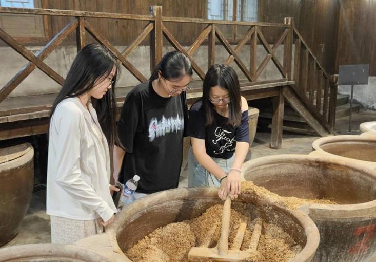 在古法釀醋工坊,實踐團成員在傳承人的指導下親手體驗了翻醅這一傳統工藝,他們循古法翻動醅料,感受原料質地的變化,在汗水與谷物的清香中,真切體會到傳統釀造“一分耕耘一分滋味”的堅守,感受到“手作”的溫度。