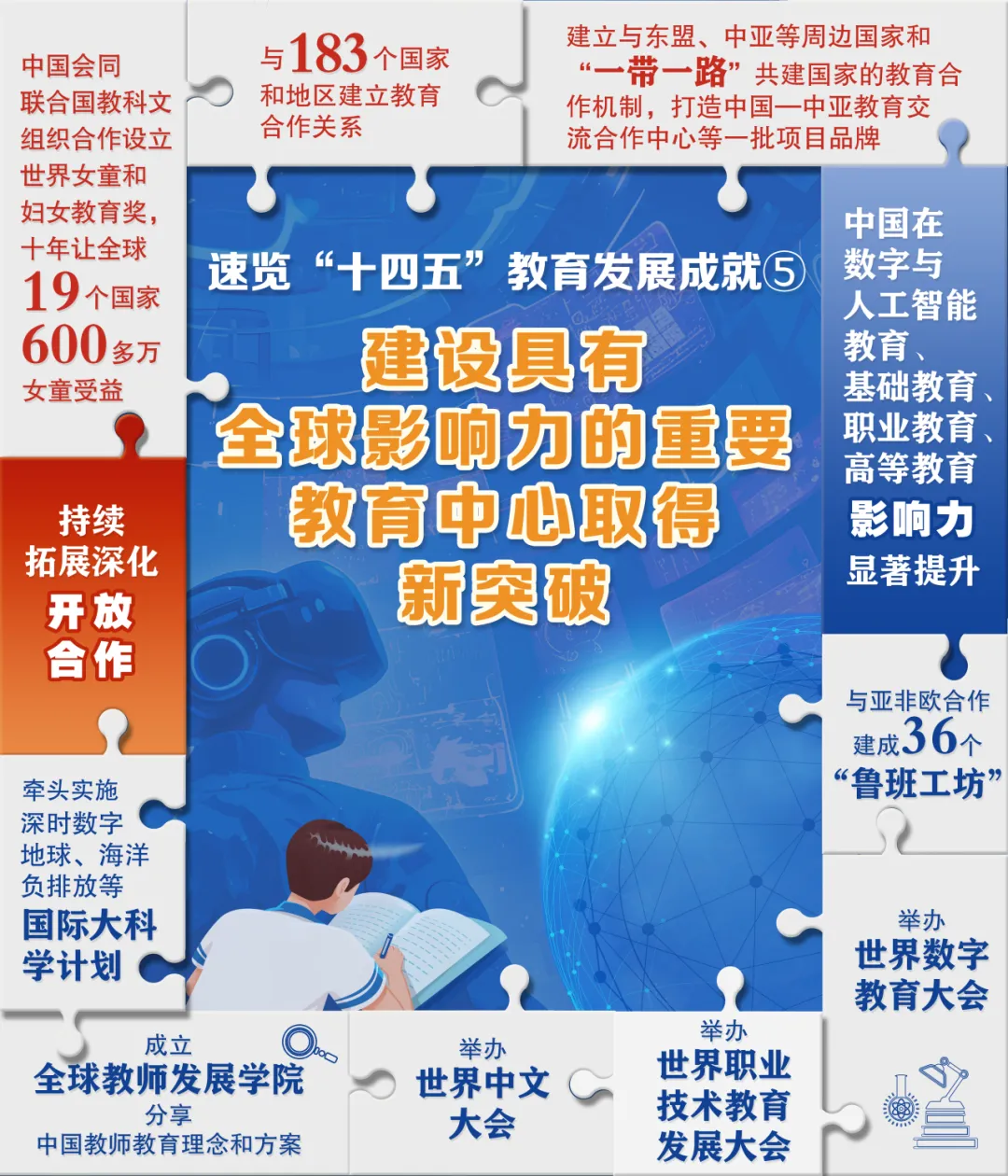 在9月23日舉行的國新辦新聞發布會上,教育部部長懷進鵬表示,“十四五”時期,在黨中央、國務院的堅強領導下,在全社會大力支持下,規劃所確立的各項目標任務已全面高質量完成。跟隨一組拼圖,一起感受“十四五”教育發展成就。看向前程,錨定十年目標,一起“拼”出教育強國美好未來——