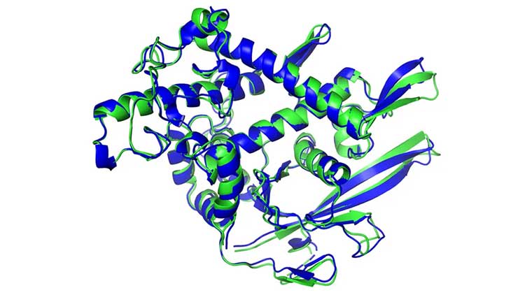 藍色為計算機預測的蛋白質結構,綠色為實驗驗證結果,二者相似度非常高。