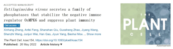中國農業大學植物保護學院孫文獻教授團隊在《植物細胞》(The Plant Cell)在線發表了題為《稻曲病菌效應因子SCRE6作為新型酪氨酸磷酸酶穩定免疫負調控因子OsMPK6以抑制水稻免疫》(Ustilaginoideavirens secretes a family of phosphatases that stabilize the negative immune regulator OsMPK6 and suppress plant immunity)的研究論文,揭示了稻曲病菌中的一種新型致病機制,其分泌一類酪氨酸蛋白磷酸酶,通過去磷酸化穩定水稻免疫負調控因子OsMPK6并抑制水稻免疫。同期的《植物細胞》(The Plant Cell)發表了Judith Van Dingenen題為《毒力效應因子致病新機制:真菌磷酸酶效應因子如何突破寄主免疫促進稻曲病菌侵染》(A virulence effector resolved: how a fungal phosphatase effector promotes rice false smut)的評論文章。