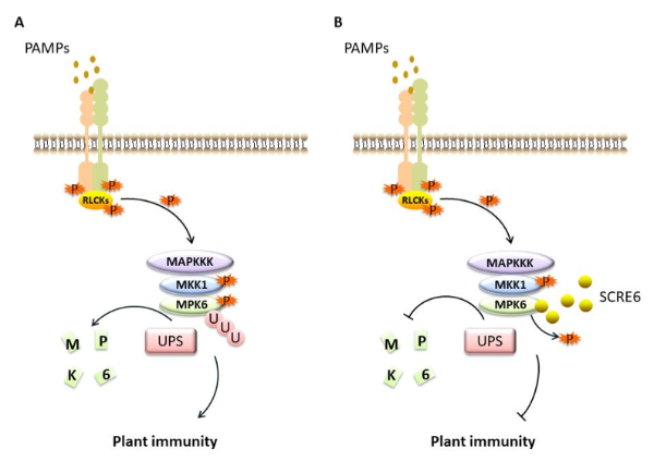 該研究以稻曲病菌富含半胱氨酸蛋白SCRE6為研究對象,證實了SCRE6是稻曲病菌中發揮重要毒性功能的效應蛋白;通過生化實驗揭示了SCRE6是一個以水稻免疫負調控因子OsMPK6(Mitogen-Activated Protein Kinase 6)為靶標的酪氨酸蛋白磷酸酶。當病原菌侵染時,水稻識別PAMP后誘導OsMPK6的磷酸化,促進其通過26S蛋白酶體途徑降解而激活水稻抗病性。而稻曲病菌分泌的SCRE6能特異性去磷酸化OsMPK6,進而抑制OsMPK6降解,該蛋白積累促進稻曲病菌的侵染;此外,在稻曲病菌中還發現3個SCRE6同源蛋白,與SCRE6構成一類新型酪氨酸蛋白磷酸酶家族。該研究揭示了稻曲病菌致病的新機制,并為通過基因編輯技術創制水稻抗病新種質提供了思路。