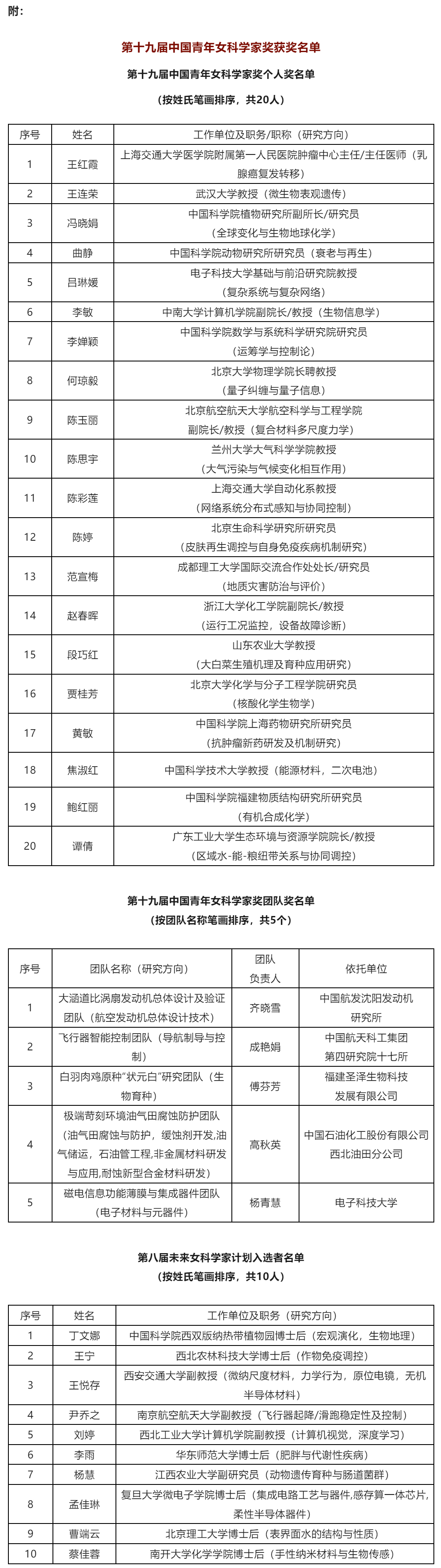 經第十九屆中國青年女科學家獎評審委員會評審,上海交通大學醫學院附屬第一人民醫院腫瘤中心主任、主任醫師王紅霞等20名女科學家獲得第十九屆中國青年女科學家獎;大涵道比渦扇發動機總體設計及驗證團隊等5個團隊獲得第十九屆中國青年女科學家獎團隊獎;中國科學院西雙版納熱帶植物園在站博士后丁文娜等10人入選第八屆未來女科學家計劃。