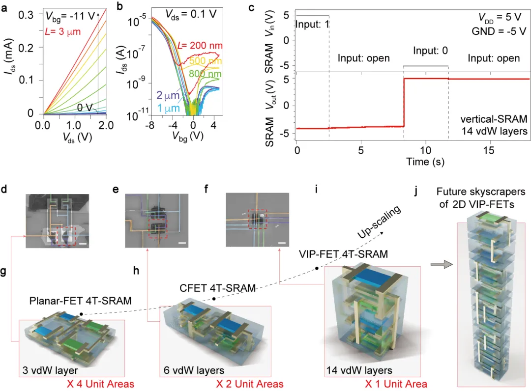 在此基礎上,該研究團隊利用垂直堆疊的方式制備了由14層范德華材料組成、包含4個晶體管的互補型邏輯門NAND以及SRAM等器件(如圖1所示)。