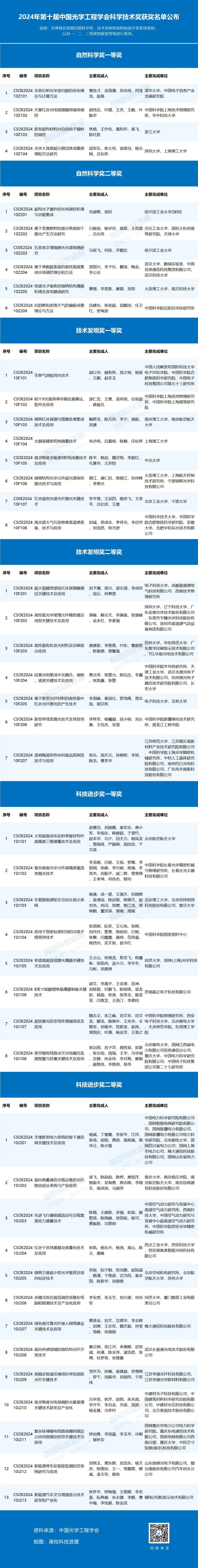 日前,2024年第十屆中國光學工程學會科學技術獎獲獎名單正式公布,最終評選出“自然科學獎”10項、“技術發明獎”15項和“科技進步獎”21項。其中,“自然科學獎”一等獎4項、二等獎6項;“技術發明獎”一等獎8項、二等獎7項;“科技進步獎”一等獎8項、二等獎13項。