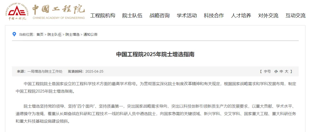 4月25日,中國工程院和中國科學院發布2025年院士增選指南,兩院院士增選工作正式啟動。