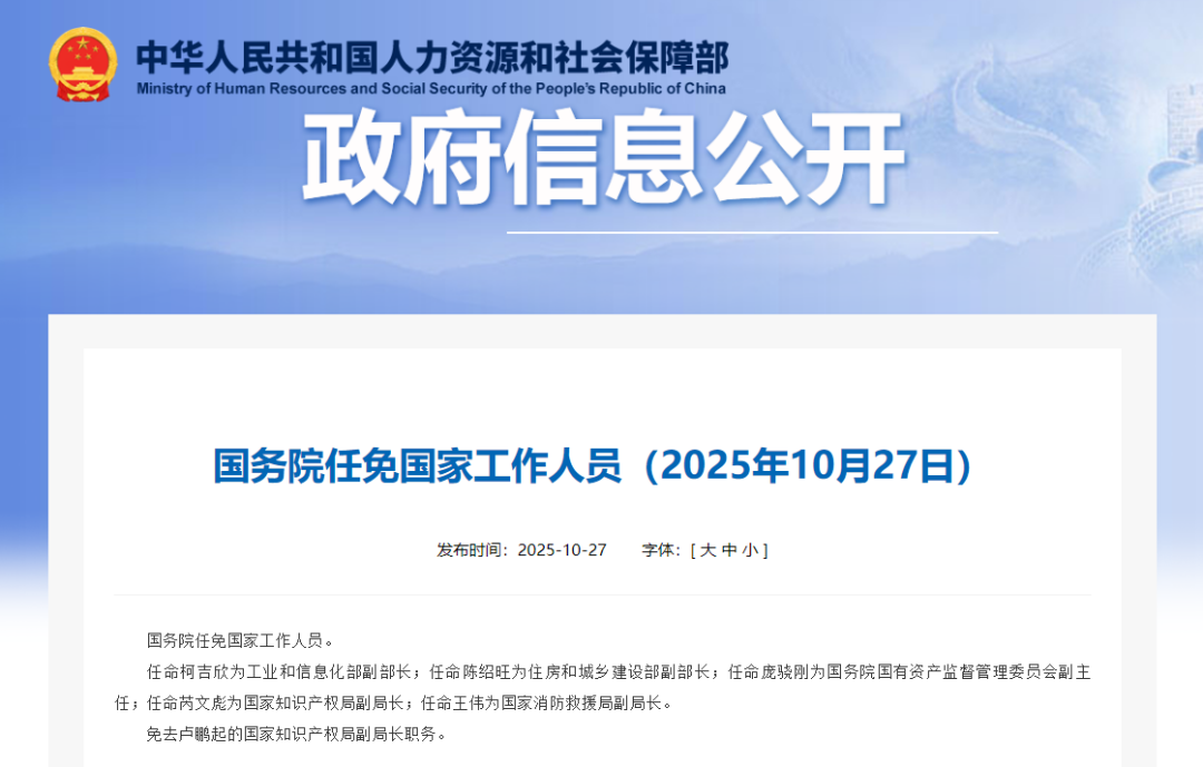 據人力資源和社會保障部網站10月27日消息,國務院任免國家工作人員:任命柯吉欣為工業和信息化部副部長。