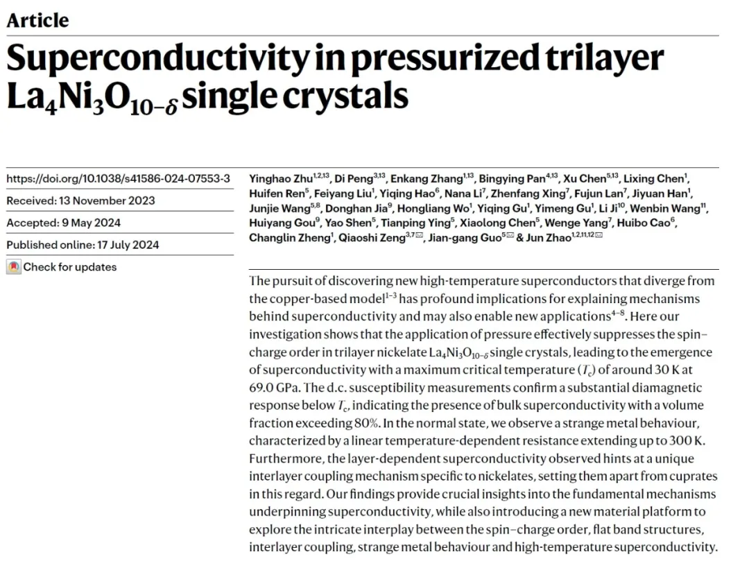 北京時間7月17日晚,該研究成果以“Superconductivity in pressurized trilayer La4Ni3O10-δ single crystals”為題發表于最新一期的《自然》(Nature)上。Nature同期在“新聞和觀點”(News&Views)專欄以“The search for superconductivity widens”為題對該文進行亮點推薦和介紹。