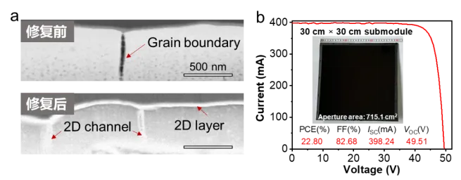 圖2 雜質修復后的鈣鈦礦薄膜及大面積高效率模組