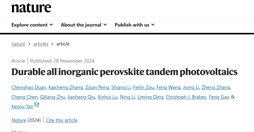 華南理工大學嚴克友教授團隊針對鈣鈦礦電池光熱穩定性差的行業難題,利用綠色配體演變策略,調控全無機窄帶隙鈣鈦礦薄膜的成核結晶,成功制備了全球首個2端全無機鈣鈦礦疊層電池,85 ℃光熱穩定性老化測試表現良好。相關成果以“Durable all Inorganic perovskite tandem photovoltaics”為題發表在Nature上。