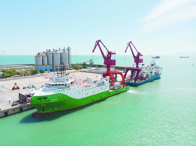 我國首艘全數配備國產化科考作業設備的載人潛水器支持保障母船——“探索二號”船抵達三亞崖州灣科技城南山港。新華社發