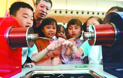 河北省滄州市路華小學學生在“流動科技館”體驗“鐵釘橋”。新華社發